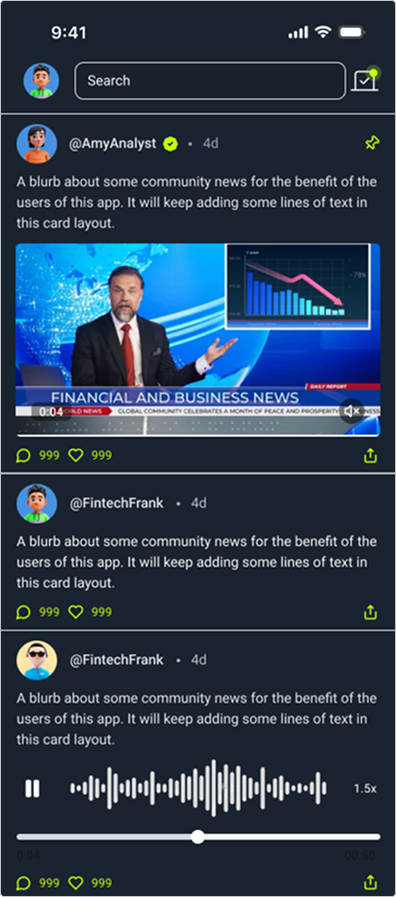 Users can track and manage their investments while staying informed through a live community feed, designed to surface sentiment, expert perspectives, and market signals without overwhelming or misleading users. The mobile-first foundation ensures the product can scale across features while remaining intuitive and trustworthy.