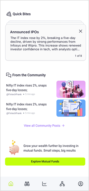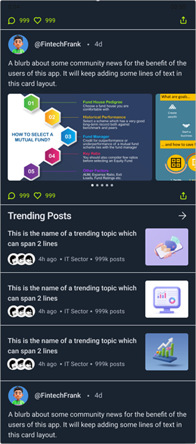 Users can track and manage their investments while staying informed through a live community feed, designed to surface sentiment, expert perspectives, and market signals without overwhelming or misleading users. The mobile-first foundation ensures the product can scale across features while remaining intuitive and trustworthy.